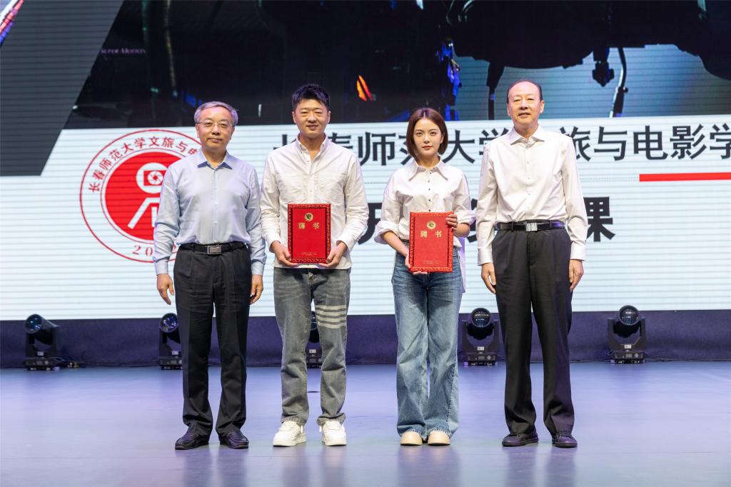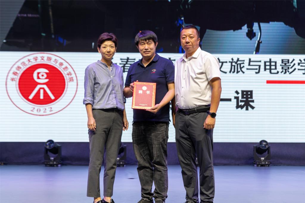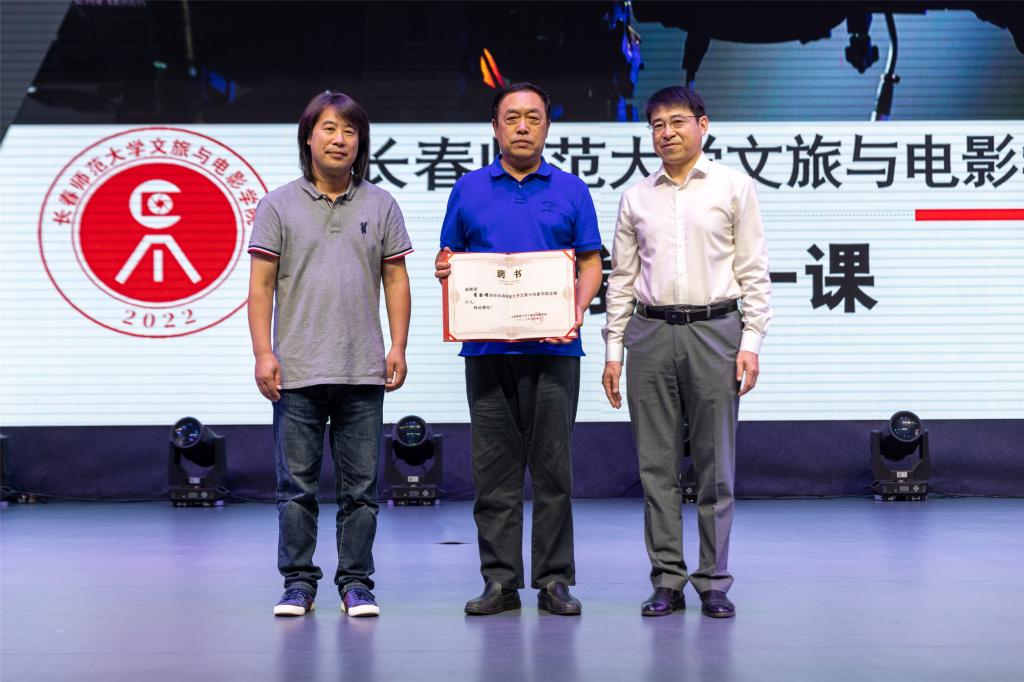 学校科研处处长费龙、美术学院院长曲鸽为崔国明颁发文旅与电影学院总制片人聘书。